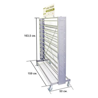 «Островкового» типа, мобильный – на подвижных колесных опорах. Двухсторонний: позволяет разместить 22 рулона клеенки. Боковые стойки имеют перфорацию. Это позволяет устанавливать дополнительно: корзины (боксы) для размещения товара и рекламной продукции; крючки для подвеса упакованных скатертей и других товаров, упакованных в пакеты. Удобен для размещения в магазинах розничной торговли. Максимально допустимая нагрузка: 22 рул. Материал: сталь с порошковым полимерным покрытием Индивидуальная упаковка: полиэтилен/карт.коробка Вес изделия: 36,5 кг Габариты единицы (дшв): 159 х 50 х 163,5 см