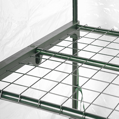Каркас из трубы D-16 мм из металла в ПВХ оплетке устойчив к коррозии. Сетчатые полки глубиной до 49 см позволяют размещать посадки двумя рядами. Нагрузка на полку до 12 кг. Расстояние между полками 31 см.